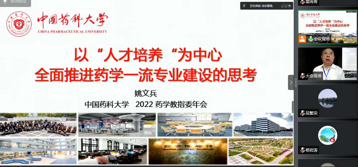 教指委主任委员、专委会主任委员、中国药科大学副校长姚文兵教授在会上讲话,强调全国药学类院校在专业建设上必须依托药学类国家级一流本科专业建设,紧紧围绕人才培养体系、课程体系、基层教学组织、师资建设等方面,全方位、深改革、重学术,按照高等教育规律和理论,强化教学学术研究,进一步推动中国药学教育改革,真正培养出符合健康中国发展需求的药学创新人才和临床药学高层次人才。