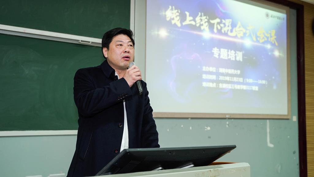 11月23日,我校在三号教学楼3117教室举行教师“线上线下混合式金课”培训。副校长熊辉,湖南省教育厅高教处、教务处、教师教学发展中心负责人、校一流课程建设项目教师、各学院及附属医院教师代表260余人参加了培训。南方医科大学教授董为人和清华大学教授裘莹作主题培训。
