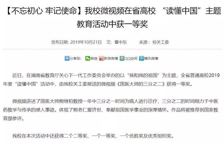 我校微视频在省高校 “读懂中国”主题教育活动中获一等奖。