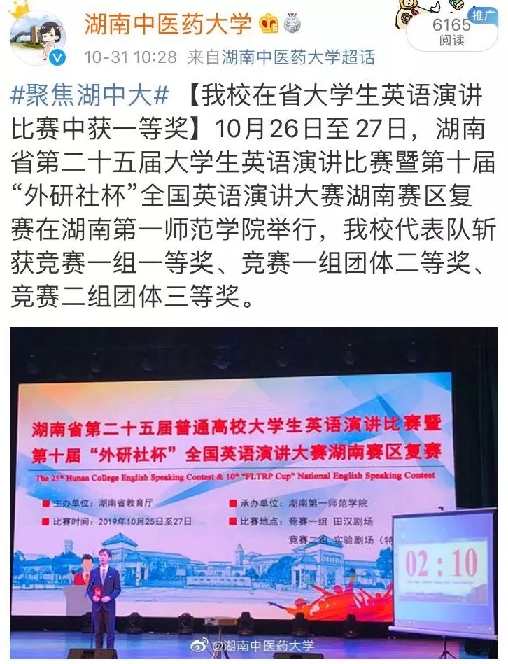 10月26日-27日,我校在省大学生英语演讲比赛中获一等奖。