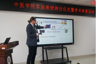 聘任仪式结束后,Per Johan Jakobsson教授作“中医药靶点微粒体前列腺素E合成酶-1和前列腺素E2的抑制剂的开发”专题知识讲座。他以类风湿关节炎的防治为切入点开展学术分享,从西医诊断治疗与中医药的特色及优势两个层面进行了系统阐述。