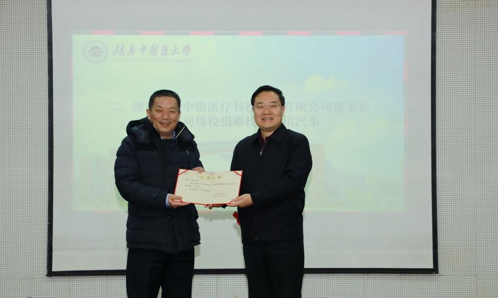 会上,湖南明康中锦医疗科技发展有限公司董事长戴征、北京同仁堂长沙药店有限责任公司总经理董后上、长沙恒生医药技术咨询有限公司董事长张钢向母校各捐赠50万元,用于傅敏铨·唐木林励志奖学金。戴征还向母校捐赠中巴车一辆。秦裕辉代表学校对校友们的慷慨捐赠表示衷心的感谢,并为校友们颁发捐赠荣誉证书。