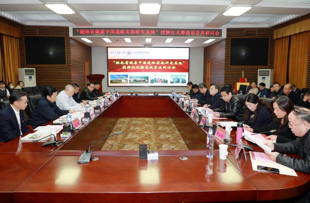 12月10日下午,“湖南省健康中国战略实施研究基地” 授牌仪式暨建设首次研讨会在行政楼一楼会议厅举行。省人民政府原副省长唐之享、省委宣传部省社科规划办主任陈湘文、省教育考试院院长唐未兵、省医保局副局长孙兆泉、省中医药管理局副局长肖文明、原省委政策研究室副主任张富泉,我校(院)党委书记秦裕辉,副校长曾福生、彭清华,校(院)党委委员、组织人事部长焦珞珈出席会议,相关职能部门、二级学院负责人及基地研究人员参会。会议由彭清华主持。