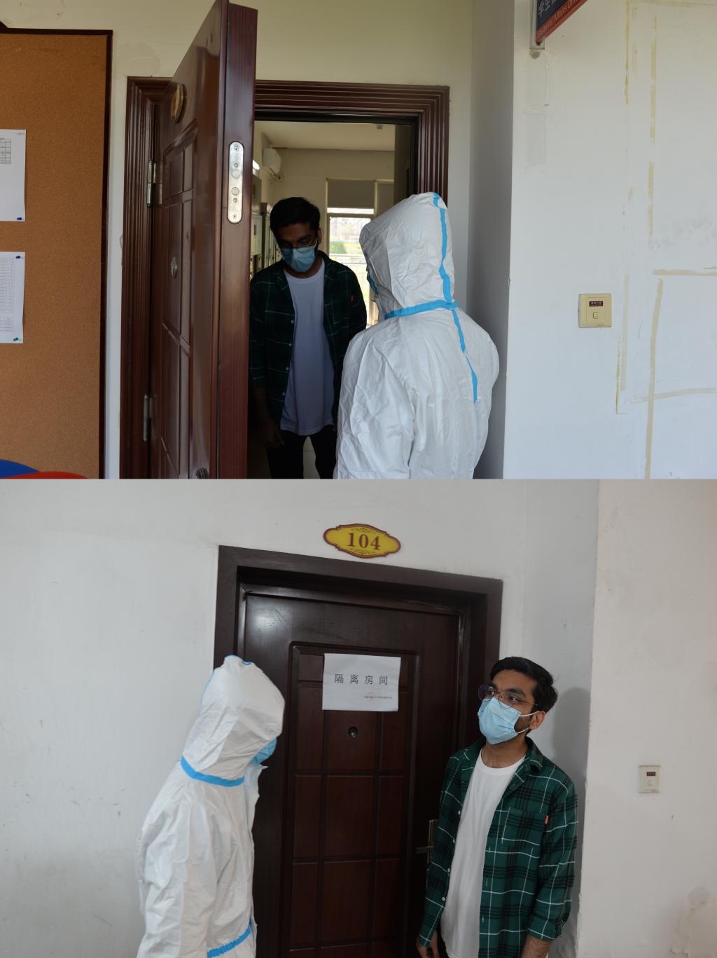 当日值班老师穿戴好防护服有序指引变码学生前往隔离房间继续观察。