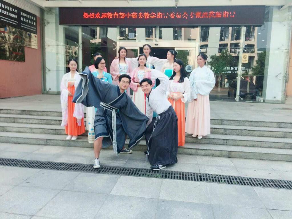 | 学生们穿汉服在国际教育学院门前合影留念 |