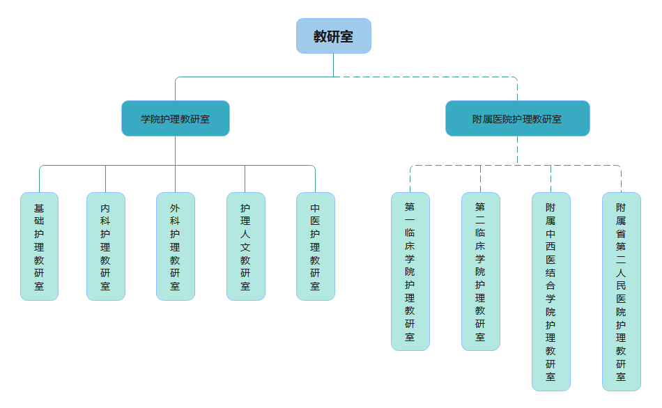 2.虚线连接的是大学直属附属医院下设3个护理教研室(前3位),非直属附属医院下设1个教研室,为业务管理下的教研室;