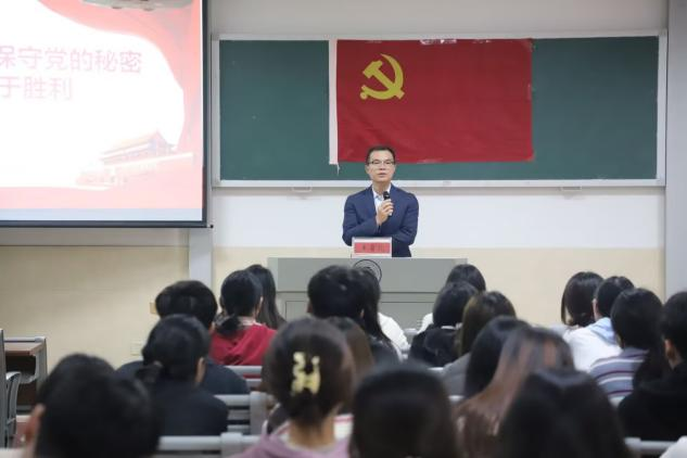 学生工作部副部长王召亿老师在济世楼108教室开展“坚定理想信念,保守党的秘密,对党忠诚,敢于胜利”主题党课。护理学院第六期入党积极分子全体学员参加本次党课学习。