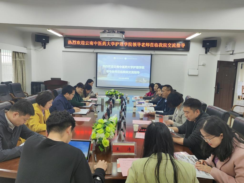 2023年3月9日上午,云南中医药大学护理学院书记毕立雄、党委副书记黄冬梅、副院长郭趣及相关科室科长、教研室主任等一行九人到我院进行护理学专业认证工作调研交流。学院全体班子成员、各教研室主任、办公室、科教科、学生科负责人参加会议,调研座谈会由罗尧岳书记主持。
