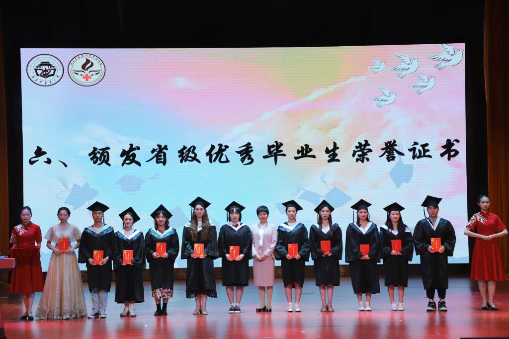 毕业典礼第一部分由黄群副书记主持,典礼在一场青春洋溢、活力四射的模特秀中正式拉开帷幕。首先,黄群副书记主持介绍了莅临本次活动的领导嘉宾并全体起立奏唱国歌。陈偶英副院长与黄群副书记先后宣读了《关于准予护理学院2021届本科生毕业和授予学位的决定》、《关于表彰护理学院湖南省普通高等学校2021届优秀毕业生的通报》。罗尧岳教授、陈偶英教授、蒋小剑教授及李春艳教授上台为毕业生代表颁发学士学位证书,张玉芬书记为优秀毕业生颁发省级优秀毕业生证书。随后师生代表依次上台发言,吉彬彬老师分享了她的青春成长经历,鼓励同学们要正确地面对生活中的困难、不断奋斗,同时祝贺同学们完成了学业,迈上了新的人生旅程,希望同学们能够践行南丁格尔的誓言,弘扬真善美。毕业生代表曹彩虹同学上台发言,表达了对母校真挚的感谢、对未来无尽的期盼及对梦想执着的追求。其后,罗尧岳教授、黄群副书记、陈偶英教授与毕业生代表互赠礼物,“教诲如春风,师恩似海深”,一幅优雅大方的字画道出了同学们对母校和老师们无尽的虔敬与感激。互赠礼物后,罗尧岳院长上台发言,他激励同学们保持斗争精神,以斗争精神圆青春之梦,继承五四精神,成为时代的接班人,并祝愿同学们前程似锦。