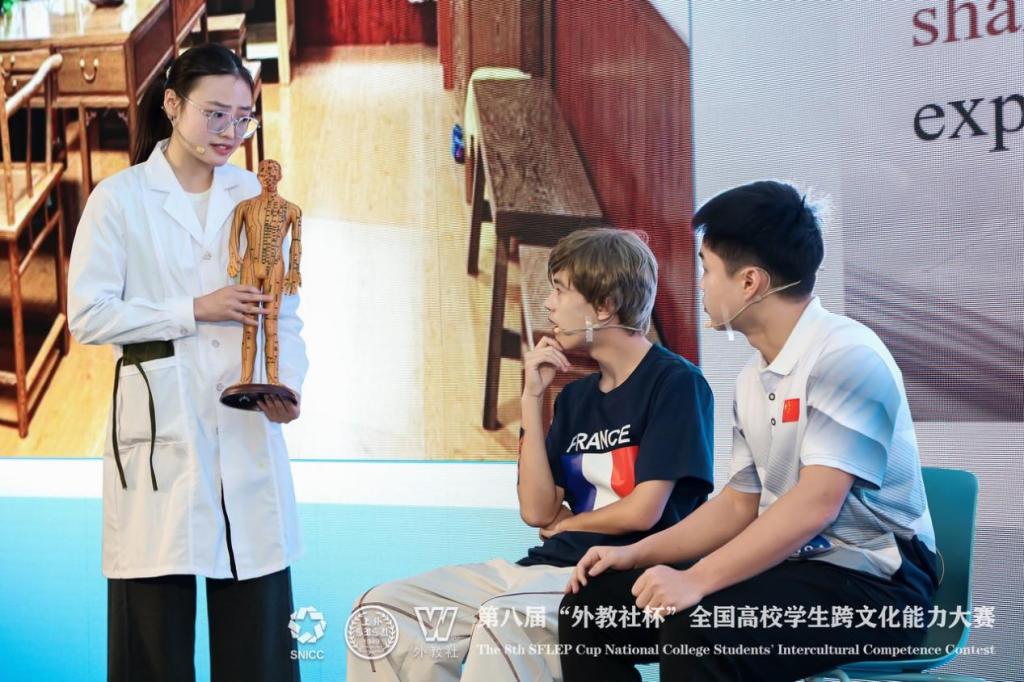 团队把学校“中医药+外语”交叉优势拧成一股绳。选题上,让“中国针灸”与“法国耳针”同台对话;表达上,用英语把“辨证、经络、整体观”讲成外国人一听就懂的故事;舞台上,英语专业学生刘佳星一袭白大褂,手持银针,三秒入戏——英语干净利落,进针手法稳、准、快,让老外get中医逻辑。最终捧回中国学生组唯一“最佳人气奖”,也为学校赢回一张闪亮的国际名片。
