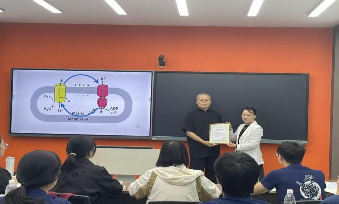 何迎春为唐炳华教授颁发授课证书。何迎春表示,唐炳华教授在生物化学领域的专业造诣与教学经验,是此次授课活动的重要保障,感谢其对我校中西医临床专业人才及青年教师培养工作的支持。