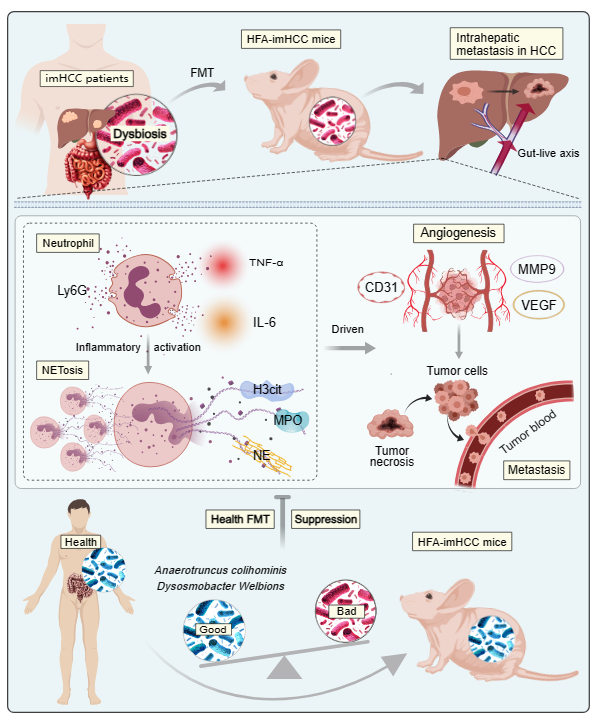 该研究利用人-鼠粪菌移植的方法,首创了肠道菌群人源化肝内转移性肝癌小鼠研究模型,基于该模型,研究发现肝内转移性肝癌患者的肠道致病菌促进了小鼠肝癌的肝内转移,并揭示了其通过过度激活中性粒细胞胞外杀菌网(NETs)促进肿瘤血管生长的致病机制。并且,研究创新地使用健康菌群移植抑制了小鼠肝癌肝内转移的病程进展。该成果为肝癌研究提供了贴近临床的动物研究模型,为肝癌肝内转移的治疗提供了新思路。
