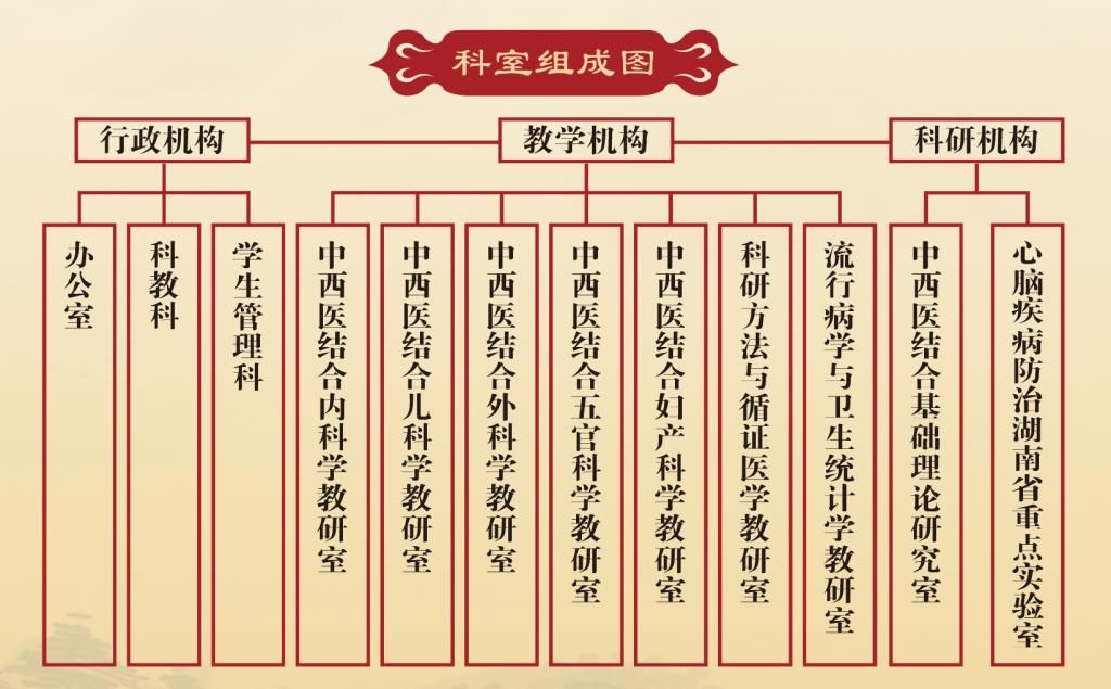 学院目前下设科教科等3个行政科室,中西医结合内、外、妇、儿、五官、流行病学与统计学、科研方法与循证医学等7个教研室及1个基础理论研究室,1个科研实验室。