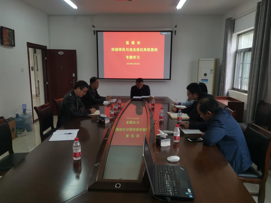 10月26日下午,基建处组织全体职工开展《师风师德与违法违纪典型案例专题学习》,会议由余建明主持。