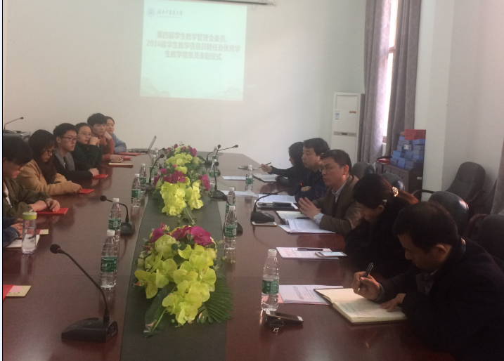 3月1日中午12:30,我校第四届学生教学信息员聘任、学生教学管理委员会成立及优秀教学信息员颁奖会议在二办公楼一楼会议室举行。教务处处长李铁浪、学生工作处副处长张湘明、校团委书记焦珞珈及全体学生教学管理委员会委员、2016级学生信息站站长、优秀信息员代表等参加了本次仪式。会议由教务处副处长、评建中心主任陈楚淘主持。