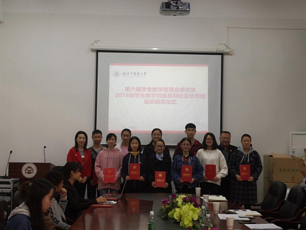 2018年11月30日中午12:30,我校第六届学生教学管理委员会委员暨2018级学生教学信息员聘任及优秀教学信息员表彰仪式在二号行政办公楼一楼会议室举行。校团委、学生工作处领导、教师教学发展中心相关老师及各学生教学管理委员会委员、各教学信息站站长参加了本次仪式。会议由教师教学发展中心副主任陈楚淘主持。