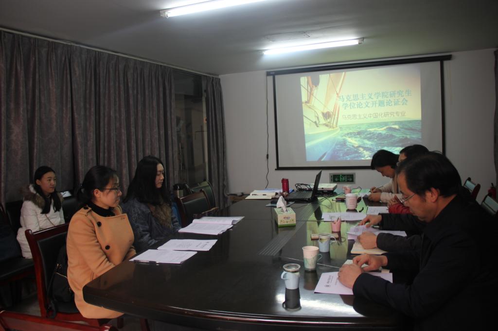 2016年12月23日下午,2015级马克思主义中国化研究专业硕士研究生开题论证会在马克思主义学院会议室召开,湖南医药学院党委委员、副院长、我校硕士生导师虢剑波研究员、人文社科学院院长毛新志教授、马克思主义学院副院长黄汀教授出席,会议由马克思主义学院党总支书记、院长叶利军教授主持。
