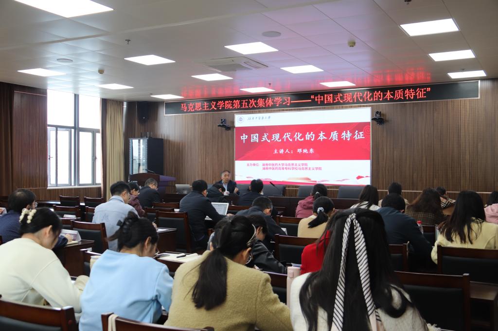4月7日下午,十三届全国政协社会和法制委员会委员、中国社会科学院马克思主义研究院原党委书记、院长邓纯东教授应邀来院作题为“中国式现代化的本质特征”的学术讲座。讲座在第三教学楼906会议室举行,由刘鸿翔副校长主持,学院全体师生、湖南中医药高等专科学校马克思主义学院部分教师共同参加。