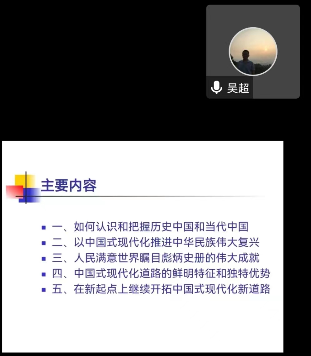 吴超研究员主要从“如何认识和把握历史中国和当代中国”“以中国式现代化推进中华民族伟大复兴”“人民满意世界瞩目彪炳史册的伟大成就”“中国式现代化道路的鲜明特征和独特优势”“在新起点上继续开拓中国式现代化新道路”五个方面对今天的主题进行了深入的讲解。吴超研究员认为,中国是一个具有独特国情的国家,历史中国辉煌灿烂,近代中国坠入深渊,当代中国世界瞩目,未来中国无限可能。他讲到:一百年来,中国共产党带领人民不懈探索,走出了一条具有中国特色、符合中国实际的社会主义现代化新道路,在新起点上继续开拓中国式现代化新道路要坚持党的领导、坚持中国道路、坚持人民至上、坚持胸怀天下。