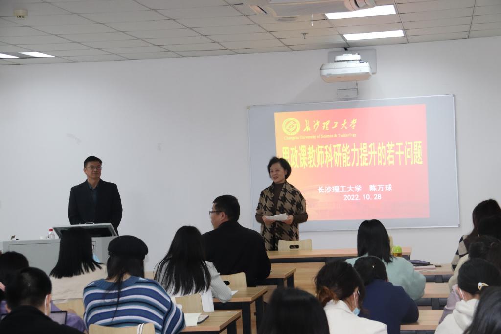 马克思主义学院、湖南食品药品职业学院马克思主义学院、湖南省高校优秀思想政治工作者(黄汀)名师工作室联合举办的“思政课教师科研的若干问题”的专题讲座在第三教学楼906教室开讲。本次讲座由长沙理工大学马克思主义学院党委书记、国家社科基金通讯评审鉴定专家、二级教授、博士生导师陈万球教授主讲,半岛手机版官网登录