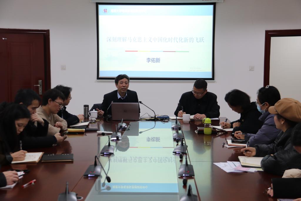 为进一步推动全院师生对党的二十大精神的研究和阐发工作,学院于12月2日下午,邀请教育部“长江学者”特聘教授、湘潭大学毛泽东思想研究中心主任李佑新教授作《深刻理解马克思主义中国化时代化新的飞跃》专题讲座。讲座在第三教学楼904会议室举行,由李晖院长主持,学院全体教师、研究生共同参加。