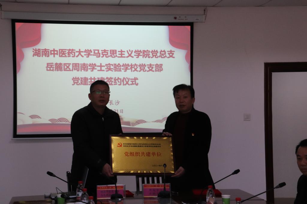 在与会人员的共同见证下,半岛手机版官网登录 马克思主义学院院长、党总支副书记李晖、周南学士实验学校党支部书记廖文星代表双方签署了党建共建协议书。
