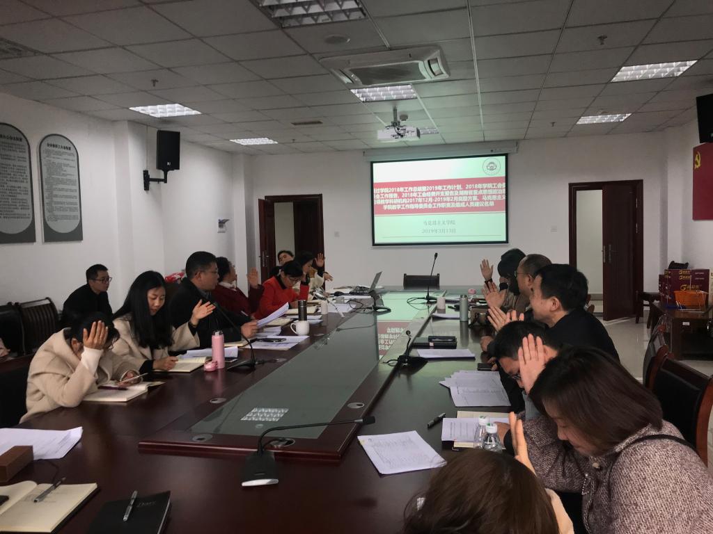 会上,全院教职工审议通过《学院2018年工作总结暨2019年工作计划》、《2018年学院工会委员会工作报告》、《2018年马克思主义学院工会经费开支报告》,听取并审议通过《湖南省重点思想政治理论课教学科研机构2017年12月—2019年2月奖励方案》、《马克思主义学院教学工作指导委员会工作职责及组成人员建议名单》。