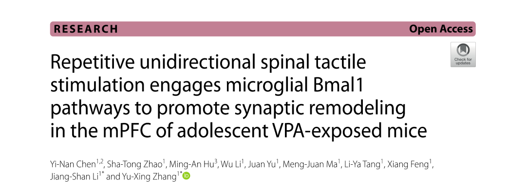 近日,半岛手机版官网登录 推拿学科在神经科学领域权威期刊《Journal of Neuroinflammation》(中科院一区,IF:10.1)发表题为“Repetitive unidirectional spinal tactile stimulation engages microglial Bmal1 pathways to promote synaptic remodeling in ...