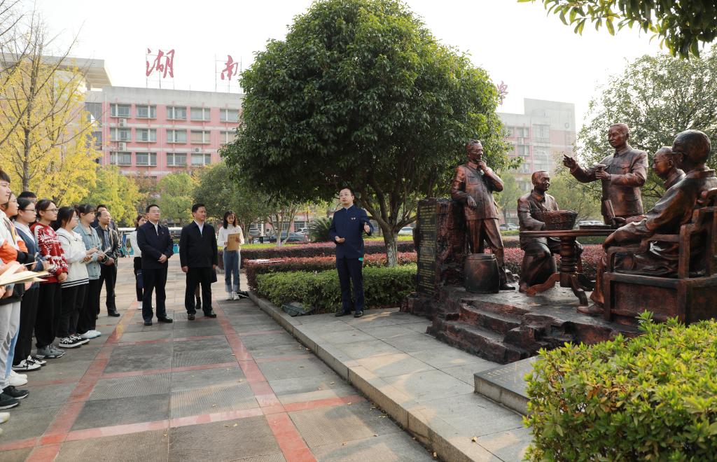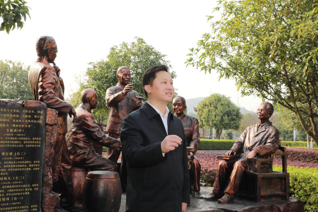 在“湖湘中医五老”雕像群前,李志超参加并指导了我校中医学院2020级国医精诚班团支部“承湖湘五老精诚,扬新时代青年精神”主题团日活动,他寄语学校广大师生青年:一要旗帜鲜明讲政治,永远听党话,跟党走,做坚定的共产主义战士;二要珍惜美好时光,心无旁骛,求知问学,不负韶华,为中医药事业贡献青春力量;三要吾日三省吾身,要修身,立大志,立大德。秦裕辉希望同学们牢记忠诚,忠诚于党,向老一辈中医人学习,为发展中医药事业而不断奋斗。