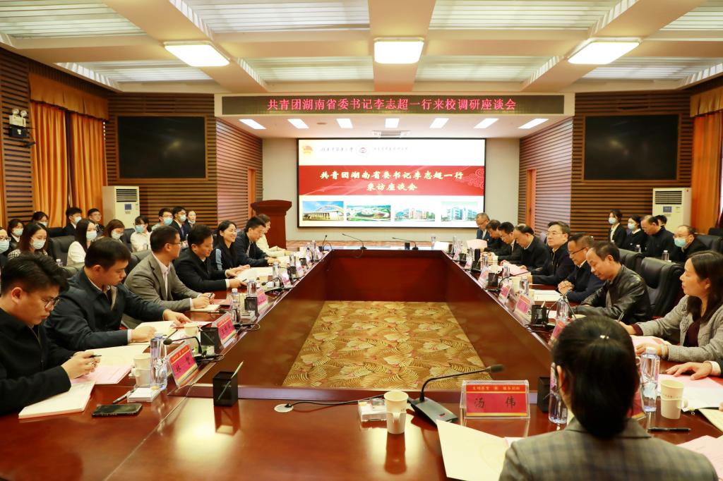 10月27日下午,共青团湖南省委书记李志超一行来校调研,了解我校团组织工作体系、学生会组织指导管理责任、团组织服务学生思想动态、港澳台学生与留学生帮扶等情况。校(院)党委书记秦裕辉、党委副书记易刚强、副校长刘鸿翔、廖菁等陪同调研,团省委学校部、办公室、青年创业就业基金会、社会联络部、青年发展部等负责同志一同考察,我校党政办、党委宣传(统战)部、校团委、学生工作部(处)负责人及二级学院团学干部参加活动。