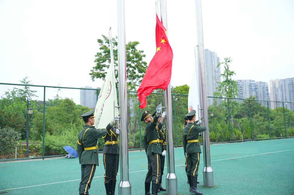 雄壮的国歌声中,国旗徐徐升起,迎风猎猎飘扬,全体人员高唱国歌。升校旗、会旗,全体奏唱校歌。