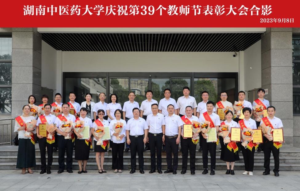 全体在家校领导,奖教基金捐赠人、湖南健康堂实业董事长罗红财先生,受表彰的全体同志、全体副处级以上干部、教师党支部书记、教研室(实验室)负责人、教师和学生代表等共计500余人参会。会上还首发了由宣传统战部特别制作的教师节专题片《师者恒行 中医盛放》,讲述湖中医教师培根铸魂、诲人不倦的杏林故事。