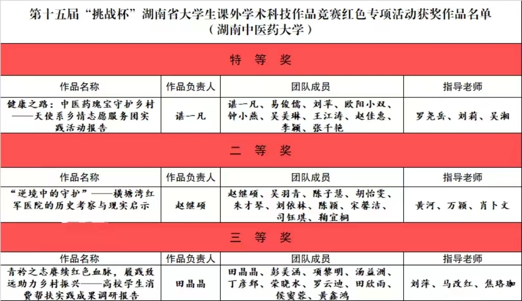 近日,共青团湖南省委对第十五届“挑战杯”湖南省大学生课外学术科技作品竞赛红色专项活动的获奖情况出炉。经学校推荐、资格审查、专家评审、公示等环节,由我校推报的《健康之路:中医药瑰宝守护乡村——天使系乡情志愿服务团实践活动报告》项目荣获省赛特等奖并入围国赛,实现了我校在此项大赛红色专项活动上获特等奖“零突破”。《“逆境中的守护”——横塘湾红军医院的历史考察与现实启示》项目获省赛二等奖,《青衿之志赓续红色血脉,履践致远助力乡村振兴——高校学生消费帮扶实践成果调研报告》项目获三等奖。