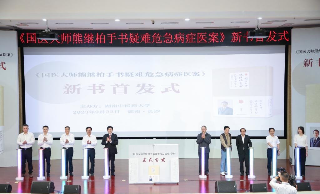 中国工程院院士刘良、国医大师我校教授熊继柏、湖南农业大学党委书记陈弘、中国书法家协会理事省文化厅原厅长周用金、我校校长易刚强、湖南省委宣传部省社科规划办一级调研员李吾秋、湖南省委教育工委宣传部(统战部)部长甘文波、湖南省中医药管理局科教处处长刘军、湘江新区卫生健康局局长帅军、湖南科学技术出版社总编辑胡艳红共同按下新书首发键,满载医者仁心和油墨香气的《国医大师熊继柏手书疑难危急病症医案》正式出版发行。