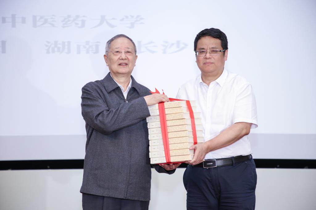 及其15所附属医院赠予《国医大师熊继柏手书疑难危急病症医案》。校党委副书记汤文胜代表学校接受手稿捐赠,并颁发捐赠证书。副校长曾福生代表学校接受赠书,并颁发捐赠证书。新书首发式由副校长熊辉主持。我校在家校领导、国家级名老中医程丑夫、湖南正清制药集团股份有限公司董事长吴飞驰、15所附属医院院领导、专家教授参会。