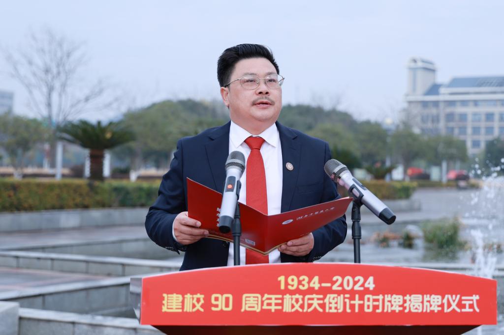 戴爱国在讲话中指出,举行建校90周年校庆倒计时揭牌仪式,打响了校庆筹备工作的“发令枪”。举行90周年校庆意义重大,一是回顾历史。在对学校办学历史的梳理中,挖掘文化底蕴,继承精神血脉,提振发展信心,增强情感认同;二是彰显当下。通过校庆活动来内聚人心、外树形象,把本次校庆打造成展示办学成就、展现学校风采的“文化工程”“名片工程”;三是展望未来。要以校庆为契机,汇聚校内外各方的智慧和力量,实现进位赶超,推动学校各项事业再启新征途、再上新台阶、再创新辉煌。同时,他表示,做好建校90周年校庆工作,要出好“四份力”:各二级单位要出力。齐心合力做好“九大主体活动”精品动作,又要做好特色自选动作;全体教职工要出力。人人都是“得分手”,事事都是“争分项”,处处都是“拿分地”;全体同学要出力。请同学们积极当好志愿者,做好宣传员,成为主力军;广大校友要出力。希望各位校友不仅是常回忆、常回望,更要常回家,为校庆活动出谋划策、捐资出力、共襄盛典、共谋发展。