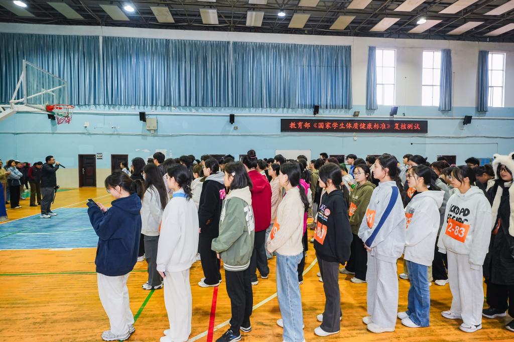 为确保复测工作安全稳定,测试前体育教师带领学生进行热身,并就各项目技术要领提供专业指导和示范。测试全程配备医护人员,测试现场安装了AED,参加测试工作的全体教师均通过红十字应急救护专项考核。