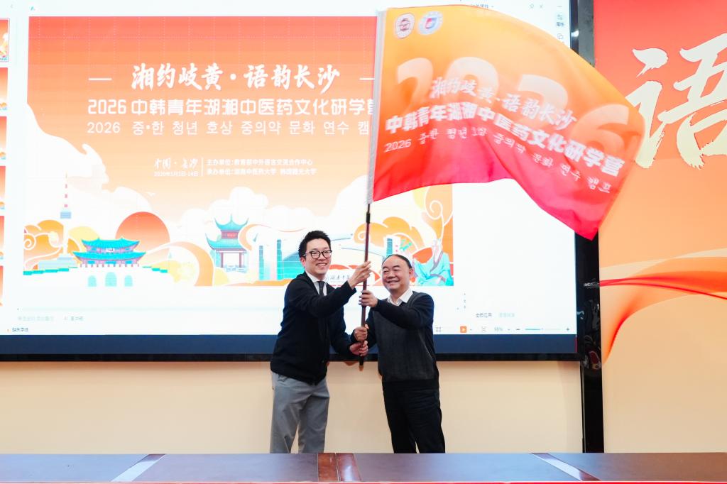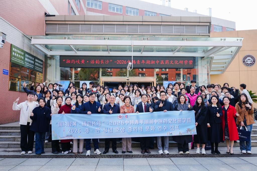 1月6日上午,由教育部中外语言交流合作中心主办,我校与韩国圆光大学承办的“湘约岐黄·语韵长沙”2026中韩青年湖湘中医药文化研学营在我校开营。45名来自韩国圆光大学等院校的师生代表来到我校,开启为期十天的中医药文化研学之旅。湖南省人民对外友好协会专职副会长王丽文,我校副校长刘鸿翔出席开营仪式。