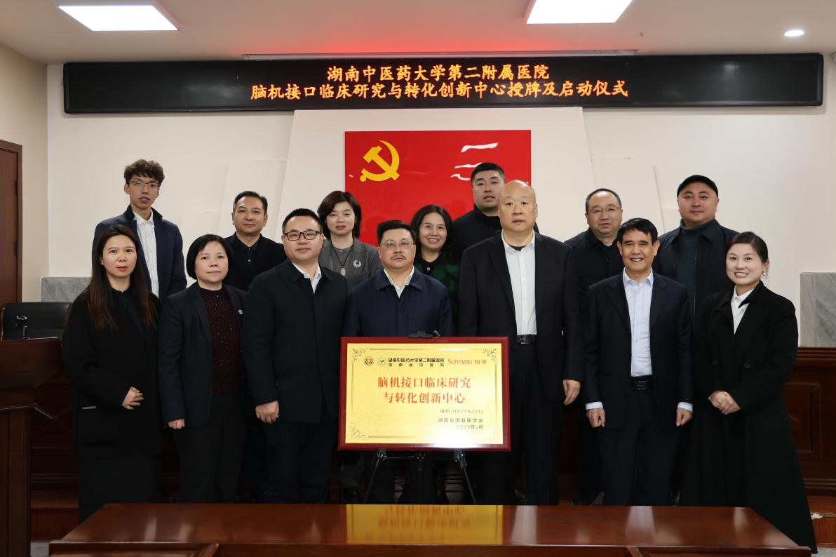 为积极响应国家科技创新与“健康中国”战略,推动中医药康复与现代前沿技术深度融合,2月11日下午,我校第二附属医院(湖南省中医院)脑机接口临床研究与转化创新中心正式成立。校党委书记、湖南省康复医学会会长戴爱国,湖南省康复医学会副会长邓景贵、副秘书长沈杰及第二附属医院在家领导班子出席启动仪式。