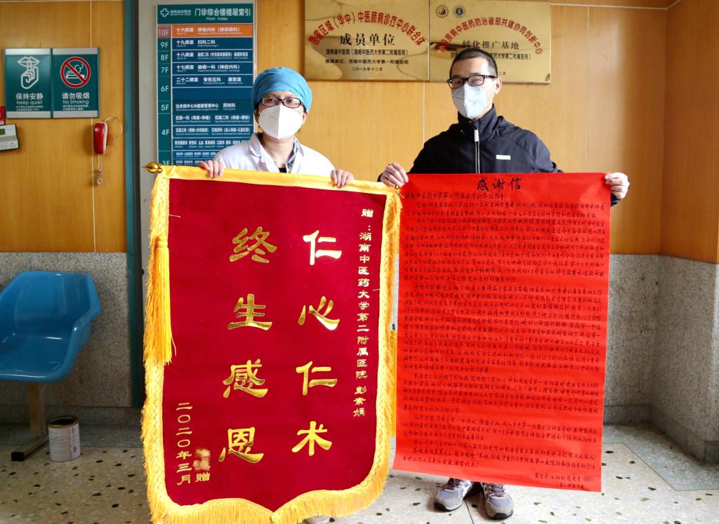 “仁心仁术,终生感恩!”3月24日,武汉新冠肺炎治愈患者唐先生委托长沙的朋友曲先生,将一面锦旗和一封感谢信送到半岛手机版官网登录 第二附属医院(湖南省中医院)呼吸内科主任彭素娟手中,并表示待武汉解禁之后,一定会亲自来院当面感谢白衣天使帮助他战胜新冠肺炎。