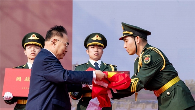 中国工程院院士张伯礼将国旗交到退役大学生士兵代表手中