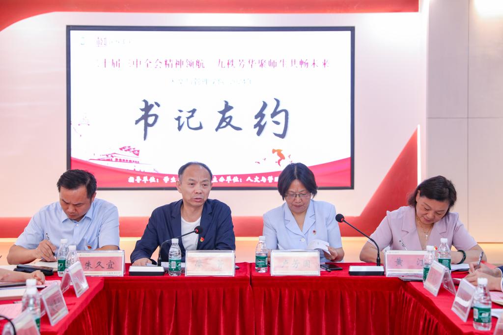 10月18日下午,我校人文与管理学院在焕然一新的“湘红书院”热烈举行2024年秋季“书记友约”活动。本次活动在学生工作部的指导下,以“党的二十届三中全会精神领航,九秩芳华聚师生共畅未来”为主题,师生共聚书院,畅谈未来如何同心勠力,共谱新篇。副校长廖菁,湖南省党代表、湖南省教书育人楷模卢芳国,学生工作部、人文与管理学院相关负责人及学院师生党员代表三十余人参加活动。