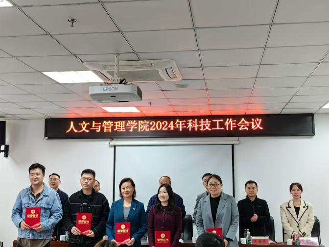 人文与管理学院相关负责人汇报了2025年国家级项目的申报工作方案及2024年科技工作会议报告。会议还表彰了获奖团队和个人。