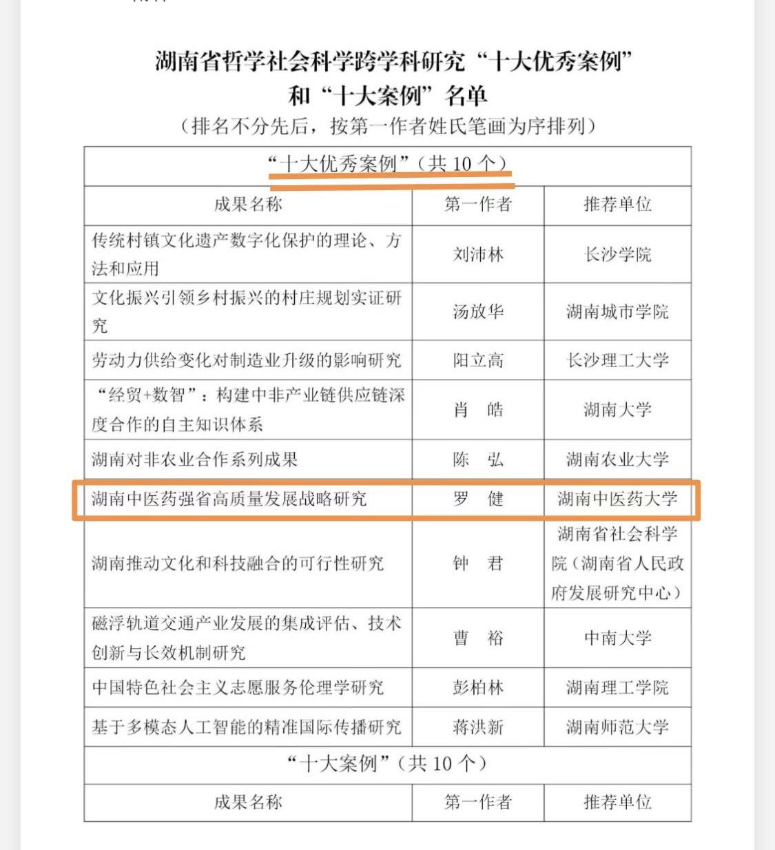 近日,湖南省社科联组织公示了湖南省哲学社会科学跨学科研究“十大优秀案例”和“十大案例”名单,我校罗健教授的《湖南中医药强省高质量发展战略研究》成功入选“十大优秀案例”。本次活动经材料审核、专家评审、省社科联党组会审议等程序,全省共评选出10个“十大优秀案例”和“10个“十大案例”。