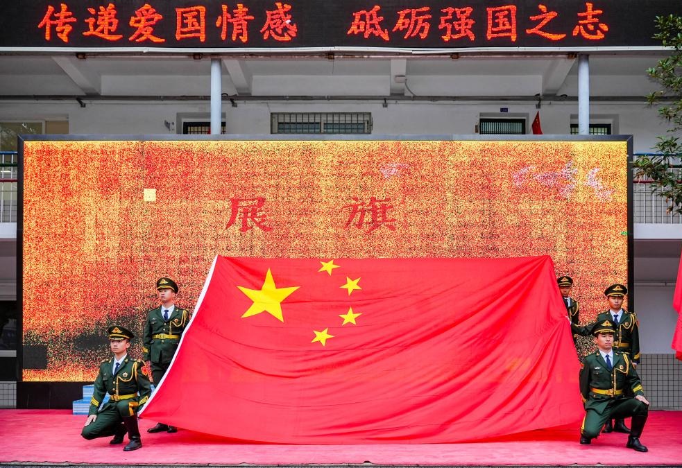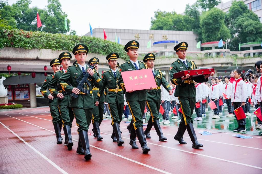 ”当天,在天安门广场升起的国旗。这面具有特殊纪念意义的国旗,在我校12名退役大学生士兵的护送下走进砂子塘小学。他们迈着铿锵有力的步伐护送国旗走向舞台,向师生们隆重地展示国旗的风采。