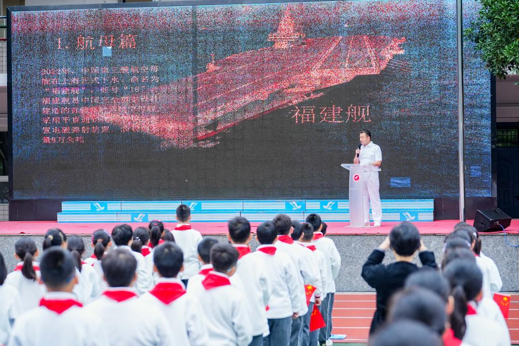 活动中,从一线航母部队转业的军官刘明同志主讲国旗下的思政课,以《传时代之风,铸强国之梦》为题,回顾中国海军航母编队发展历程,深刻讲述了航空母舰、舰载机、驱逐舰、护卫舰、潜艇、综合补给舰的相关知识,他鼓励孩子们树立爱国信念,传承爱国精神,为中华民族伟大复兴而努力奋斗!