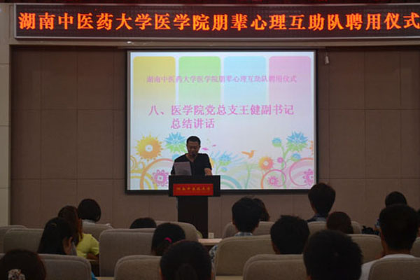 院党总支王健副书记委作总结发言。他号召全体朋辈心理互助队员要借助朋辈心理互助平台,发扬团队协作精神,扎实做好朋辈心理互助工作,开展富有特色的朋辈心理互助活动,帮助同学们成为身心健康、人格健全的医学人才,并要在实际工作中努力做到三点,一是要提高自身素养,领悟“助人自助”的教育理念;二是要增强责任意识,关心、关注和关爱身边的同学;三是要坚持求真务实,深入细致地配合老师做好工作。