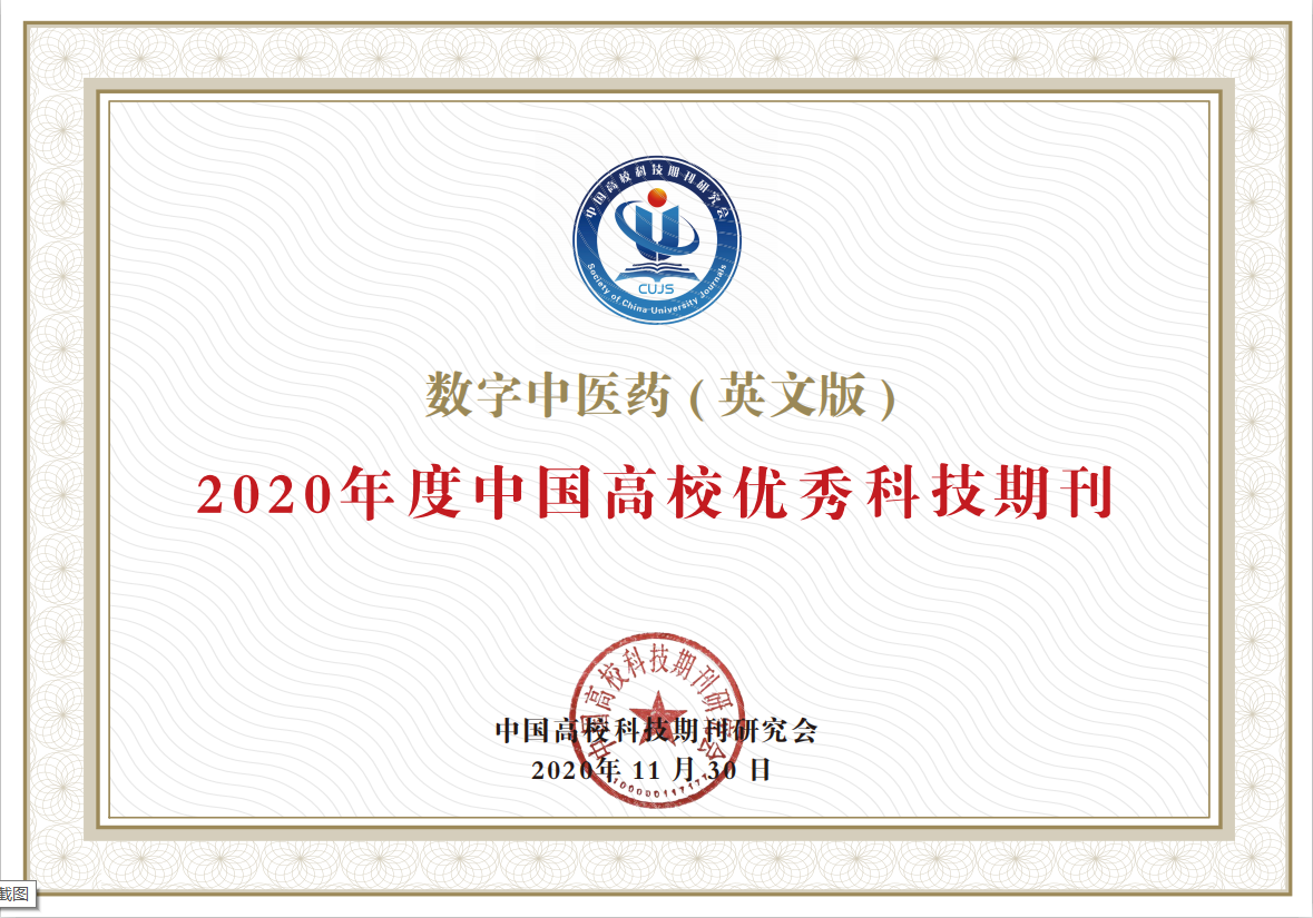 近日,中国高校科技期刊评奖结果在中国高校科技期刊研究会期刊论坛上发布,《数字中医药(英文)》(Digital Chinese Medicine)荣获“2020年度中国高校优秀科技期刊”称号。