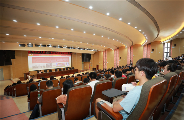 9月10日,校(院)党委理论学习中心组学习暨党员领导干部学习课堂在第三教学楼一楼学术报告厅举办庆祝中华人民共和国成立70周年宣讲报告会。全体在家校(院)领导,校(院)处以上干部,教师代表,学生代表,部分老教授、老领导、离退休教师代表600余人参加学习。宣讲报告会由校(院)党委副书记、校(院)长戴爱国主讲,校(院)党委副书记肖小芹主持。
