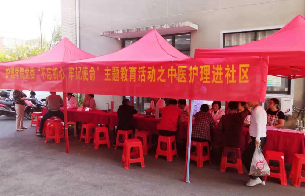 9月25日上午,护理学院党委联合学士街道社区卫生服务中心走进学华村举行“不忘初心、牢记使命”主题教育之中医护理进社区活动,为老年人进行免费体检,以及中医问诊和健康教育咨询。
